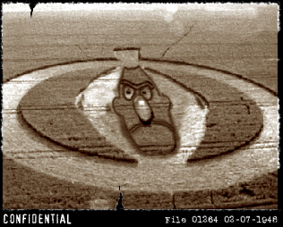 For months I tried to hack the F.B.I. crop circle files because an anonymous friend told me about a crop circle in the shape of Bert's head. Yesterday I finally made it in. This picture was taken back in 1948, because crop circles weren't very common tback then, local authorities didn't file it. After a few years the F.B.I. found it in a private collection of a local police officer. He died two months later in a train crash. Why the F.B.I. tried to hide this evidence, I'm not sure. Maybe they already knew about Bert's links with the extra-terrestial.
