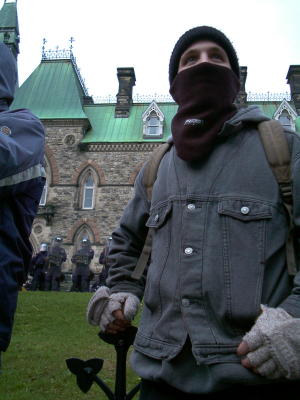 November 18 , 2001 This is What Democracy Looks Like "Never doubt that a small group of thoughtful committed citizens can change the world. Indeed it is the only thing that ever has." -Margaret Mead ![]() this protester stands on a wall in front of a Canadian Parliament building with riot police in the backgroundaround noon on Saturday The story of my adventures is Ottawa is turning out to be so long that I have split it up. You can navigate to all the parts from this page. I will slowly add to the site as I get more time. Please check back. Also I really want other perspectives of this story and other protests that happened this past weekend. Friday: crossing the border, first rally,black block leads snake march, and Starhawk ritual. Saturday: the march Sunday: In my ineloquent tirade, this iswhat I forgot to say. None of this worksif we don't all work at it. It willtake everyone to make a better world.I don't say you should be out thereprotesting. I say you should become informedand then decide if and how youshould act. When you act, remember to continuethis dialogue. Talk to everyone you know about it. Talk to the people whoyou don't think will be respective. Get to know other opinions and views.Even people with opposing views will learn simply from having a respectfulconversation. NY Times Articles Argentina clings to IMF meeting spotlight, thousands protest GA. Army school Ottawa Sun Articles demonstrators keep their cooland police stand by use of force CBC Articles G20 makes promises, protesters make noise Ontario Independent Media Centre has a good play by play of the whole event Global Domocarcy Ottawa organized the coalition and the event. Check out their 10 reasons to oppose the IMF, World Bank, G20 meeting, and 4 demands of the IMF and World Bank. Pictures are included in the text of my story for now. Other Voices: please send me commentary or stories. mixim@northnet.org November 21: Only Poetry Can Address Grief:Moving Forward after 911 By Starhawk New York Times Article: A Better Chance for Free Trade New York Times Article: Protesters Find the Web to Be a Powerful Tool New York Times Op/Ed:Blessings and Bombings Join Me Friday November 23rd in celebrating BUY NOTHING DAY |